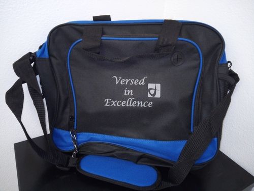 $10 Black & Blue Messenger bag with screen printed in gray " Verse in Excellence and logo"