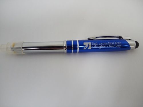 $2 Metal pen with stlyus and LED light.,Black ink, Blue cap ingrave "