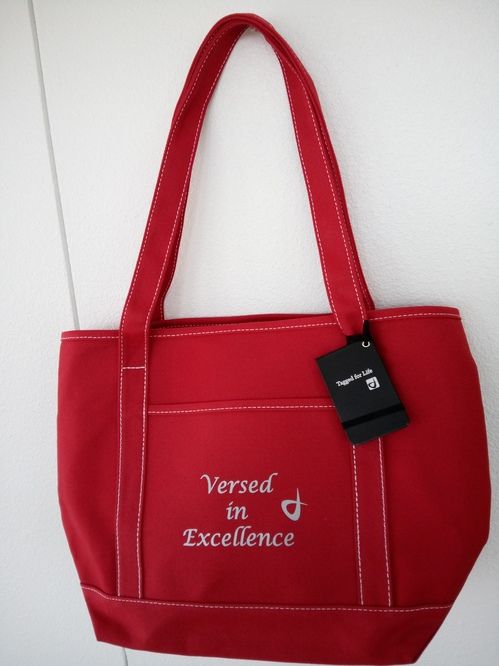 $12 Large Red Tote Bag with white stitching and front pocket; inscribed "Verse in Excellence".