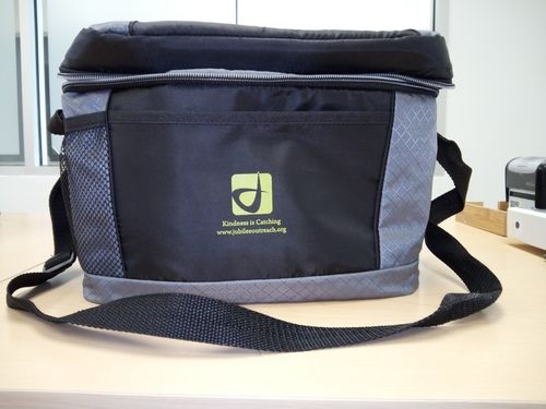 $15 Black and gray insulated bag Keeps content hot or cold (size 9"L x 6.5"H x7"W) with shoulder strap and screen printed in neon green "Kindness is Catching and Logo" on front