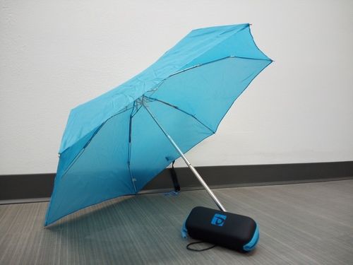 $7 Bright Blue unbrella size: 37" Arc; folds to 6 inches, comes with a black hard case with bright blue zipper