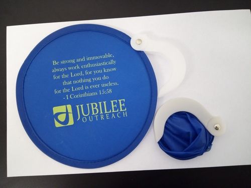 $3 This is a 7” diameter royal blue nylon fan that folds into its handle for convenient carrying.