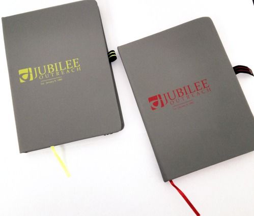 $4 Gray hardback cover with white lined notebook paper, includes an elastic closure strap, pen loop and a ribbon bookmark.. Size: 7" x 5" x 1/2" Available in neon or red branding